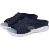 I love the Easy Spirit Traveltime series. They always fit. I’ve purchased multiple colors to match basic wardrobe colors; it enables me to “rest” & dry shoes usually worn barefoot. They last longer! And–The low backs mean no blistered heels.