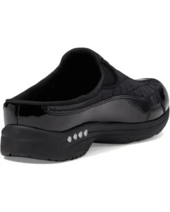 I absolutely love these shoes! I own five pairs. They are very comfortable and provide great support. I am on my feet all day, and these shoes feel so wonderful, I do not want to take them off at the end of the day. They are easy to slip on and, unlike most mule style shoes, they fit like a closed heel. There is none of that flip-flopping that some mule shoes have. These shoes has a great shock absorbency, similar to high-end athletic shoes. The heel cushioning is superior. I have always been a fan of Easy Spirit, but these shoes stand apart as real winners and a work horse in my closet.